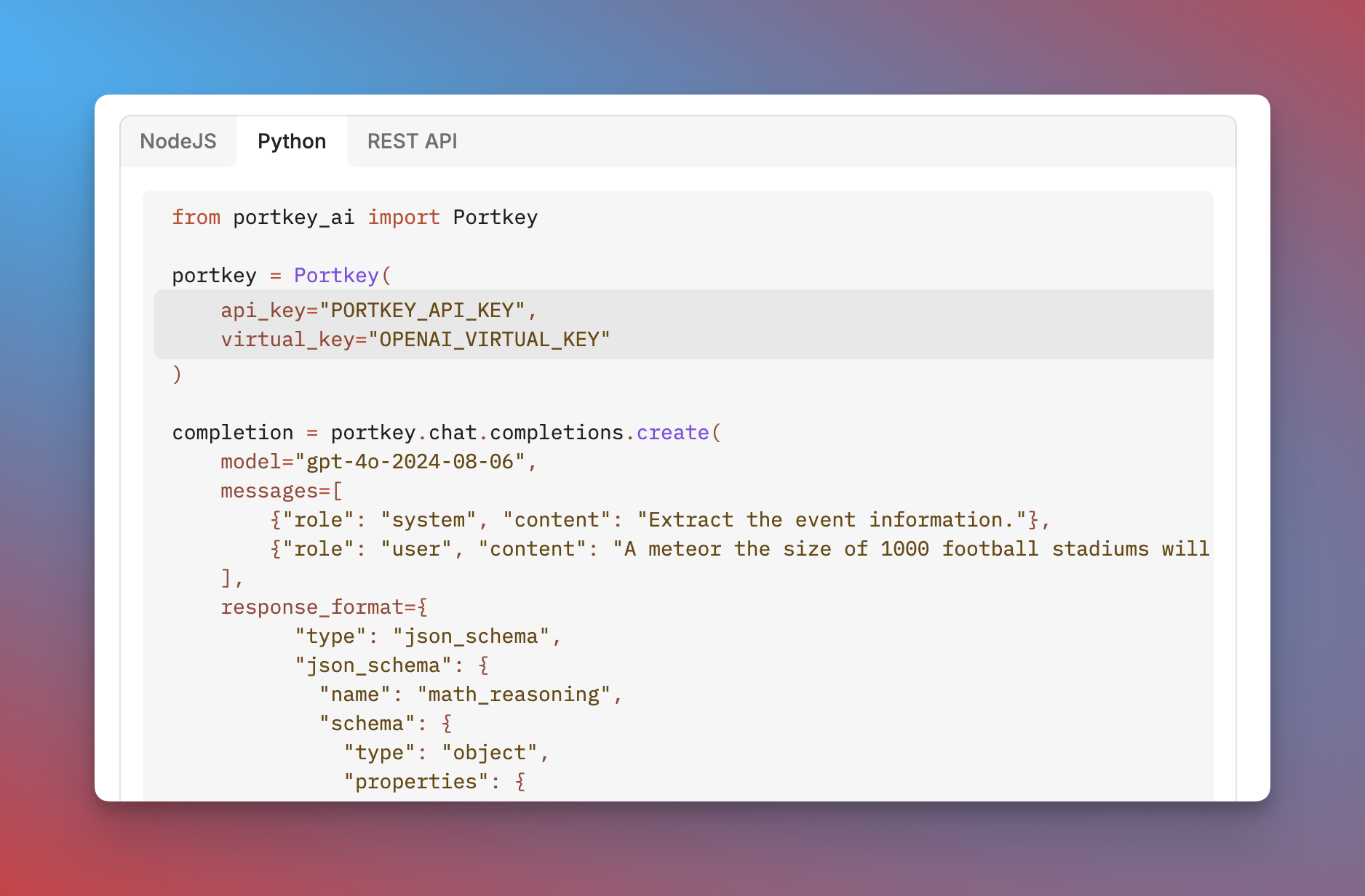 Just start sending the JSON schema in the response_format param, and Portkey will log all your requests and calculate cost, tokens, latency for them.
